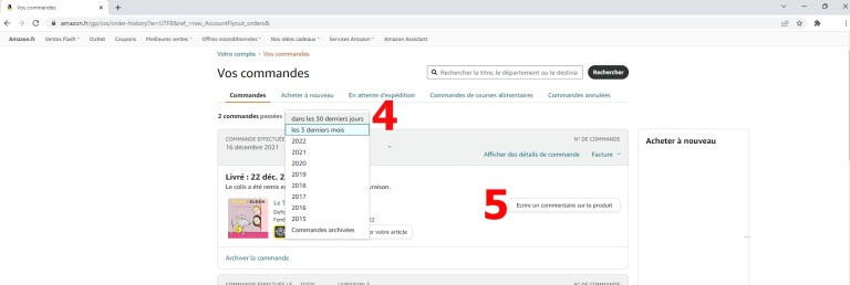 Retrouvez-le dans votre liste de commandes passées et cliquez sur Écrire un commentaire sur le produit.