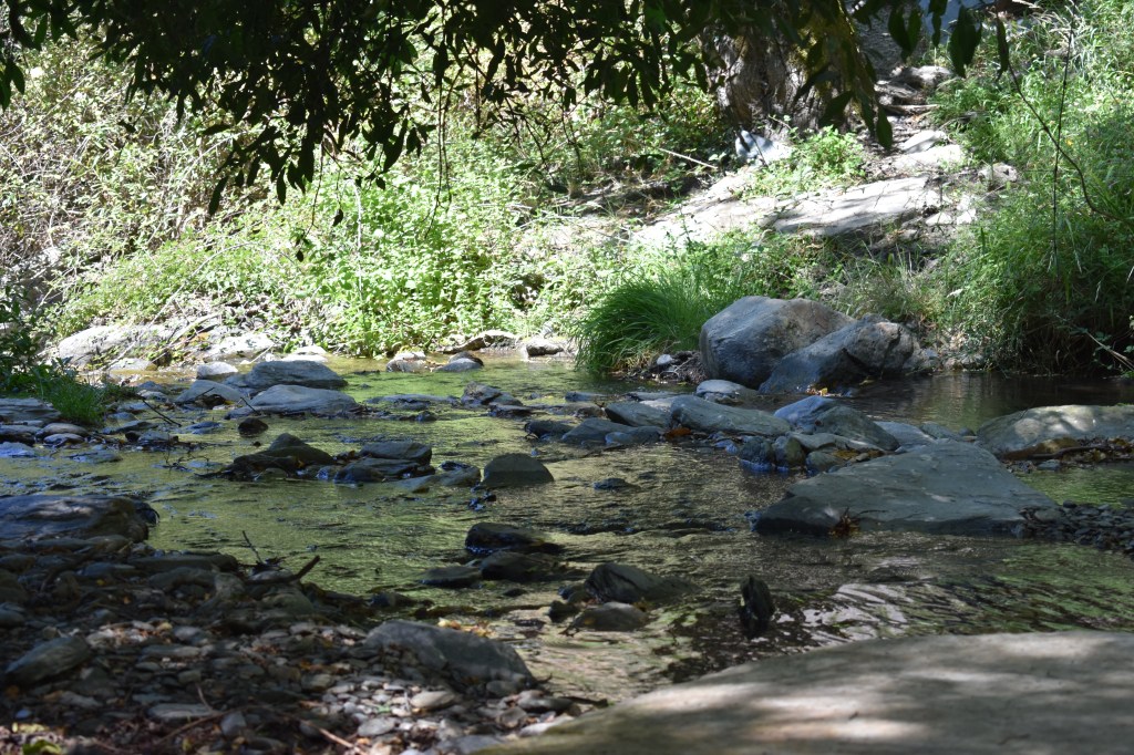 La végétation était dense, la pente escarpée ; nos chaussures menaçaient à tout moment de glisser et de nous entraîner des dizaines de mètres en contrebas. Nous ignorions si nous faisions fausse route ; je me demandais, en repoussant les branchages et en évitant que les ronces ne signent mes jambes, si ce chemin aux herbes jaunes et écrasées avait été ouvert par l’homme ou l’animal. La pente était si abrupte que la remontée me semblait hypothéquée. Alors nous piquions toujours plus vers le Lanjarón, prudemment, en croisant les doigts, et nous entendions le chant des flots se rapprocher. Nous gagnâmes des rochers qui paraissaient marquer la fin de la piste et l’échec de l’entreprise, mais ceux-ci débouchaient sur une épingle où un petit escalier naturel offrait une dernière rampe vers le cours d’eau. S’épanouissant à l’ombre de la falaise que nous venions de descendre, le Lanjarón se dévoilait enfin à nous. L’aire était calme, inoccupée, propice au pique-nique. Cependant nous n’avions emporté aucune nourriture avec nous et il nous restait encore sept kilomètres d’aventure.