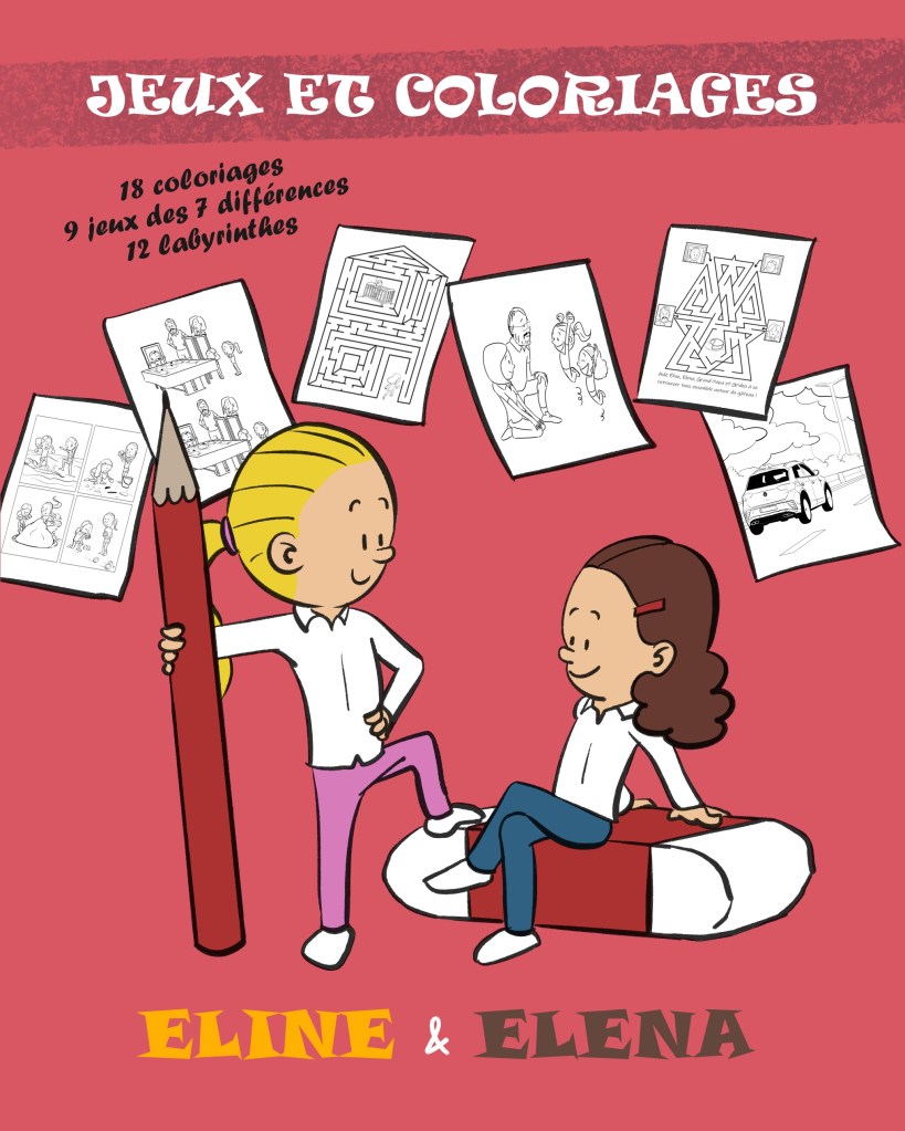 Avis aux parents d’enfants turbulents ! J’ai récemment publié un cahier de loisirs inspiré des trois albums de la collection Éline et Elena, un cahier qui renferme plus de quarante jeux et coloriages.
