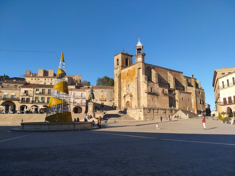 « Et puis », comme chantait Jacques Brel avant d’introduire Frida, et puis vous arrivez à la plaza Mayor, qui surgit au milieu du marasme comme un rafraîchissant mirage. Une fabuleuse esplanade, aux dimensions prodigieuses si vous la comparez à tout ce que vous avez observé jusque-là, aux mesures dignes d’une grande ville, d’une capitale, s’ouvre tout à coup devant vous. Encadrée par de multiples façades vieilles de plusieurs siècles, dirigée vers l’insolite église Saint-Martin de Tours en face de laquelle se dresse une statue équestre du conquistador local Francisco Pizarro, la grand-place de Trujillo baigne sous les splendeurs du soleil. Escaliers et degrés vous permettent de l’observer de haut, puis de vous en éloigner pour apprécier l’essence moyenâgeuse des alentours.
