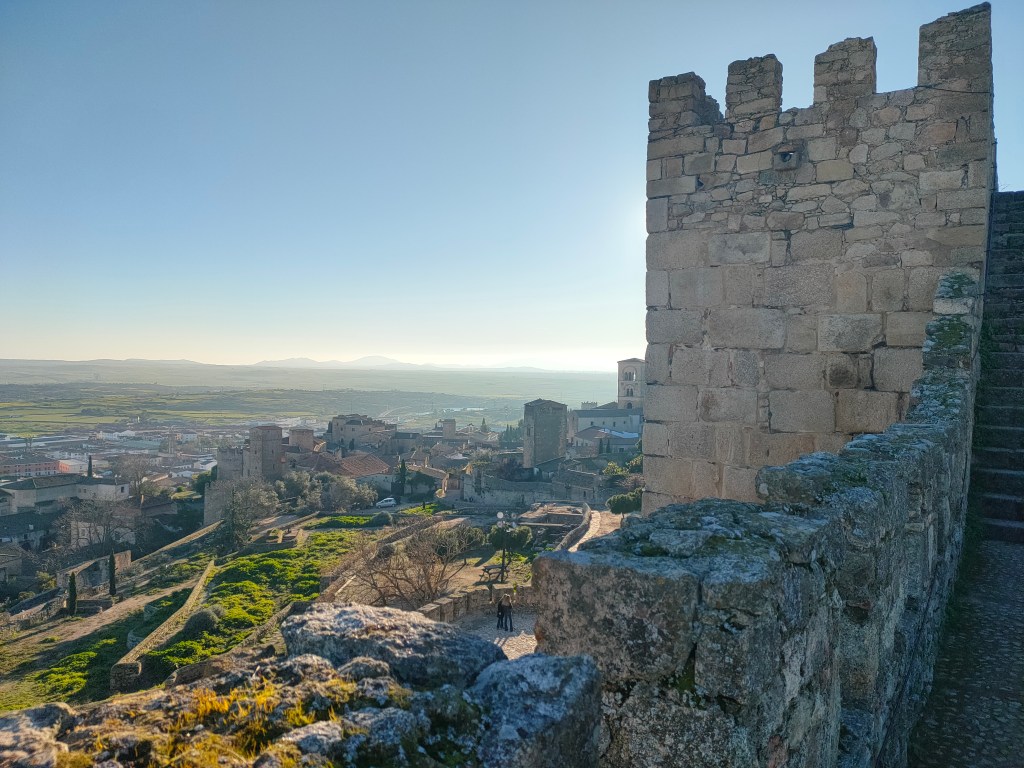 Les abords de l’église de Santa María la Mayor, haut perchée, vous offrent un avant-goût des paysages infinis qui peuvent s’observer depuis l’Alcazaba. Cette citadelle, vide en son cœur mais aux murs et remparts toujours debout, est excellemment située d’un point de vue stratégique ; elle permet de voir à plusieurs dizaines de kilomètres à la ronde. En marchant sur son chemin de ronde, vous vous rendez compte de ses dimensions impressionnantes eu égard à la taille modeste de la municipalité de neuf mille âmes et une question finit par se présenter à vous : comment diable se fait-il que cette place forte, qui a une histoire riche, un patrimoine exceptionnel, une beauté propre ne se soit jamais développée en une grande ville comme tant d’autres ? Quel est le mystère faisant que l’extension infinie des vieux centres historiques n’a pas touché Trujillo ? Pourquoi certains lieux sont-ils condamnés à la modestie quand d’autres concrétisent leurs rêves de grandeur ? L’Histoire a ses énigmes et vous, vous avez votre histoire : vous avez visité un magnifique hameau injustement trop méconnu et jamais vous ne pourrez oublier l’impression rafraîchissante qu’il vous a laissée en cet après-midi hivernal.