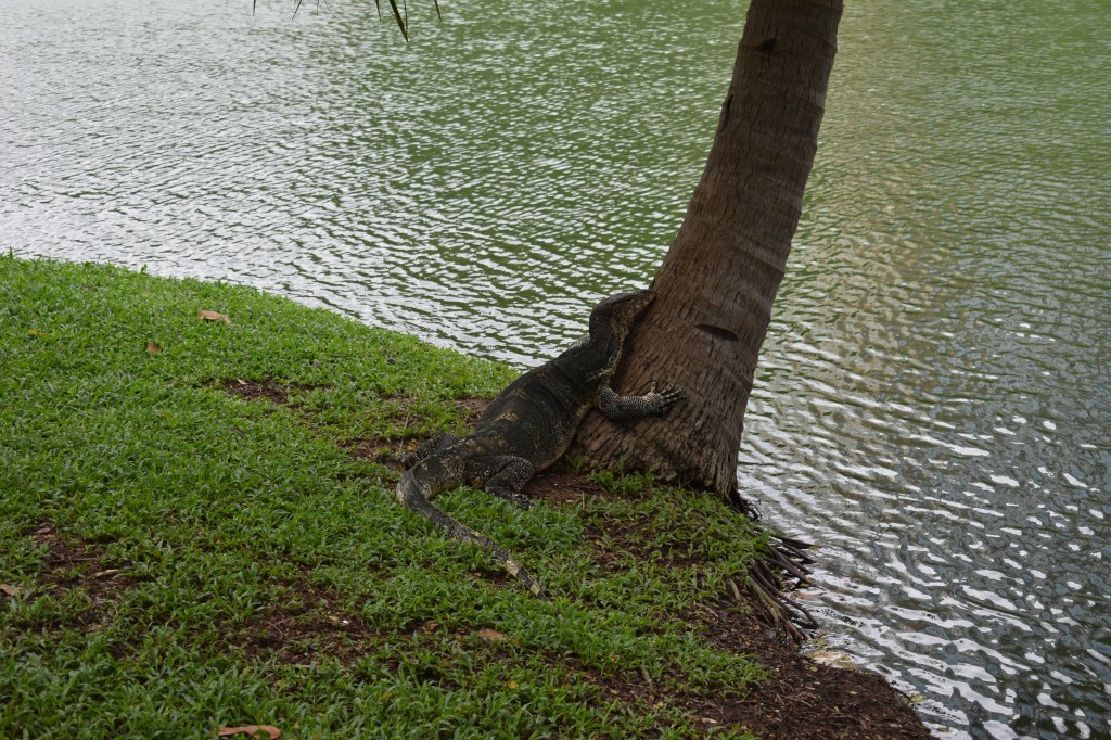 Dans le parc Lumpini, nous partîmes en quête de petits autels. Tout à coup, ma compagne m’indiqua quelque chose à deux mètres et je fis presque un bond. Un animal à la peau écailleuse, que sur l’instant je pris presque pour un crocodile dépourvu de gueule, se tenait figé au sortir des fougères qui bordaient le petit ru. Il mesurait un bon mètre et nous fixait de l’œil.