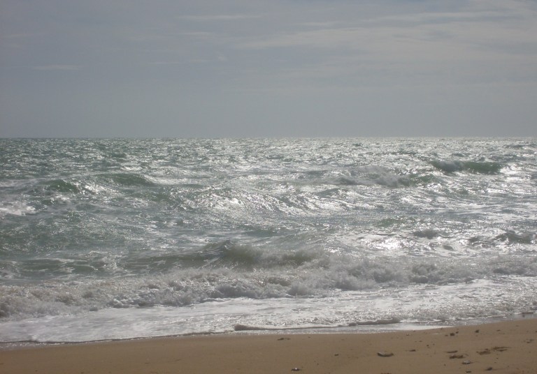 Au loin, les petites barques de pêcheurs, que l’on voit régulièrement ancrées sur la tiédeur du désert, se sont mises à flotter sur la nappe maritime comme par réflexe. Le long de la digue, les palmiers étonnés semblent approuver du chef la courageuse qui s’est jetée à l’eau — et qui ne fait en fait qu’imiter chiens et enfants plus loin. À l’opposé, à l’horizon, des traînées blanches brisent la droiture de la ligne de fond — infimes reflets des jeux de couleur qu’offre le ciel nébuleux. Ce sont des vagues impatientes, pressées d’embrasser leurs consœurs de la mer d’en face en ce point de retrouvailles larmoyantes.