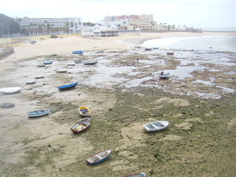 Courbée comme une crique, délimitée de part et d’autre par deux vieux châteaux qui s’enfoncent dans la mer, la plage de Cadix fond dans une douce pente de la digue jusqu’à l’écume des vagues.