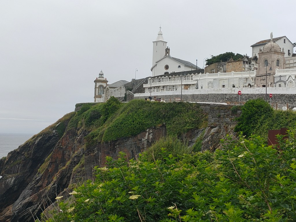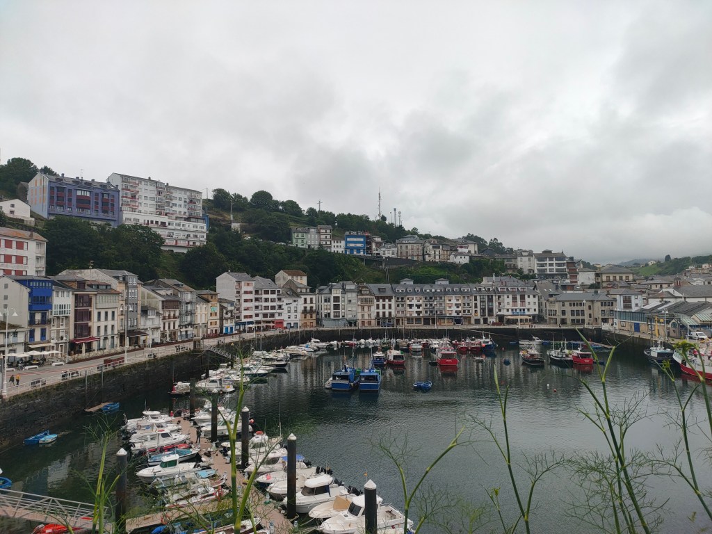Ce n’est qu’en montant ses pentes que vous apprenez à l’apprécier, comme si l’effort de la marche méritait récompense, comme si votre vision plus distante s’attachait moins aux détails qu’à l’ensemble. Vous ne regardez plus tel bâtiment ou tel pont mais un tableau où la nature a la part belle. Luarca s’invisibilise peu à peu, elle se marie au décor, au vert des arbres et au gris du ciel. Plus vous vous élevez, plus vous remarquez son imbrication avec la nature, ici la mer, là les flancs montagneux, plus loin une falaise. Les nuages qui couvrent le ciel et escamotent le lointain parachèvent l’étrange phénomène.